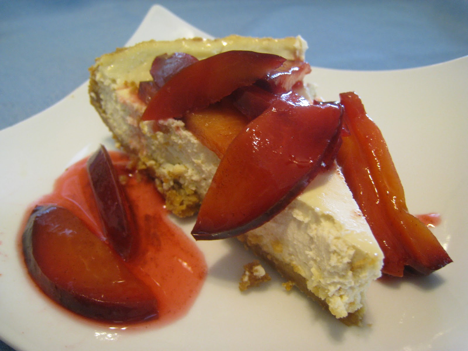 Just before serving, clean and slice four plums. Sauté in a small pan with 3 tablespoons of sugar, ¼ teaspoon cinnamon and ¼ cup water. Stir until the plums are soft and the sugar makes a nice sauce.Spoon over cheesecake.