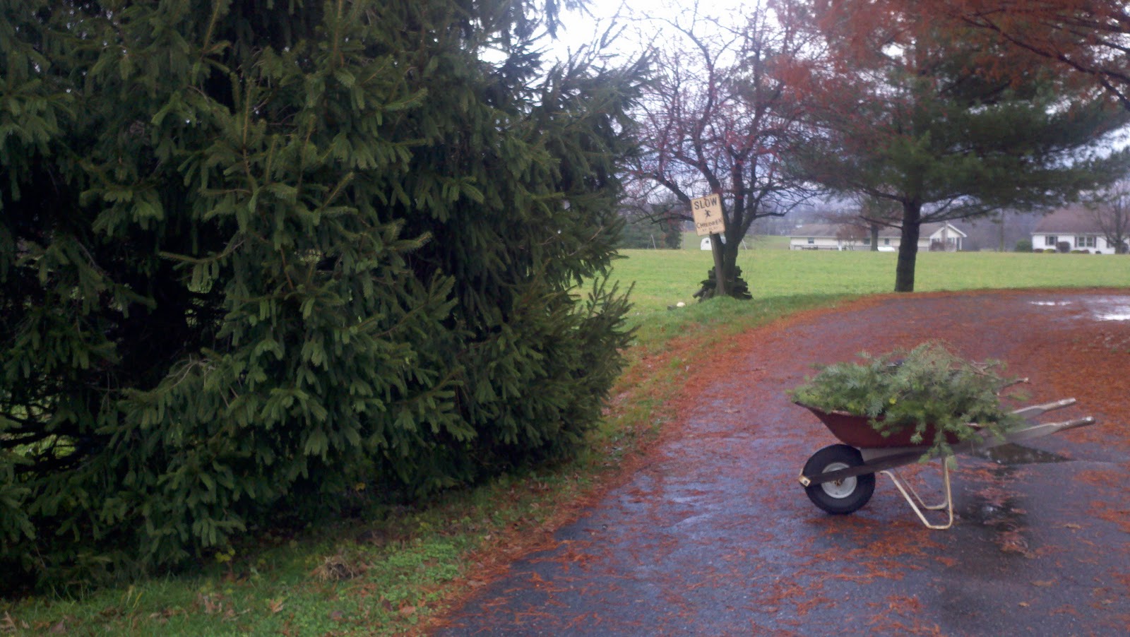 As luck would have it, my neighbor cut down a large evergreen about a week ago.  Don't worry - it wasn't this magnificent tree.  We just borrowed a few branches from him.  My friend Karen and I made several runs with the wheelbarrow down Main Street…and she magically transported empty concrete urns into works of art in front of the inn.